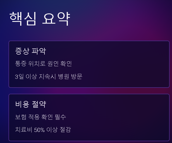 통증 시작 시점, 강도(1-10점), 지속 시간을 스마트폰 메모장에 매일 기록하세요. 어떤 자세에서 아픈지, 밤에 더 심한 지도 함께 적어두면 의사 진단에 도움 됩니다.