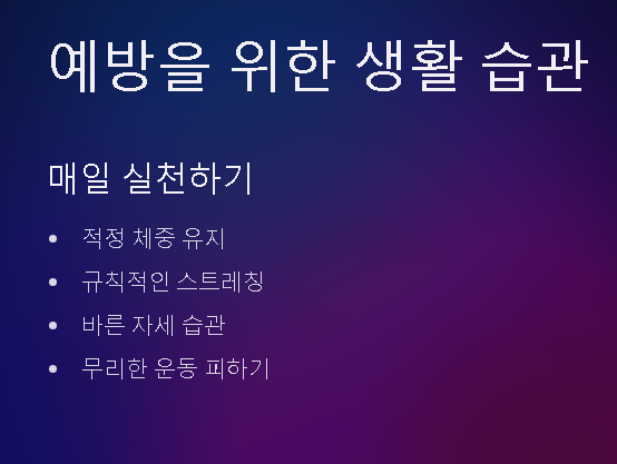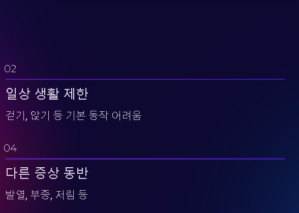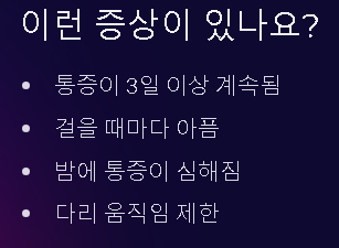- 계단 오르내리기 무리하게 반복 - 염증 악화 및 연골 손상 위험